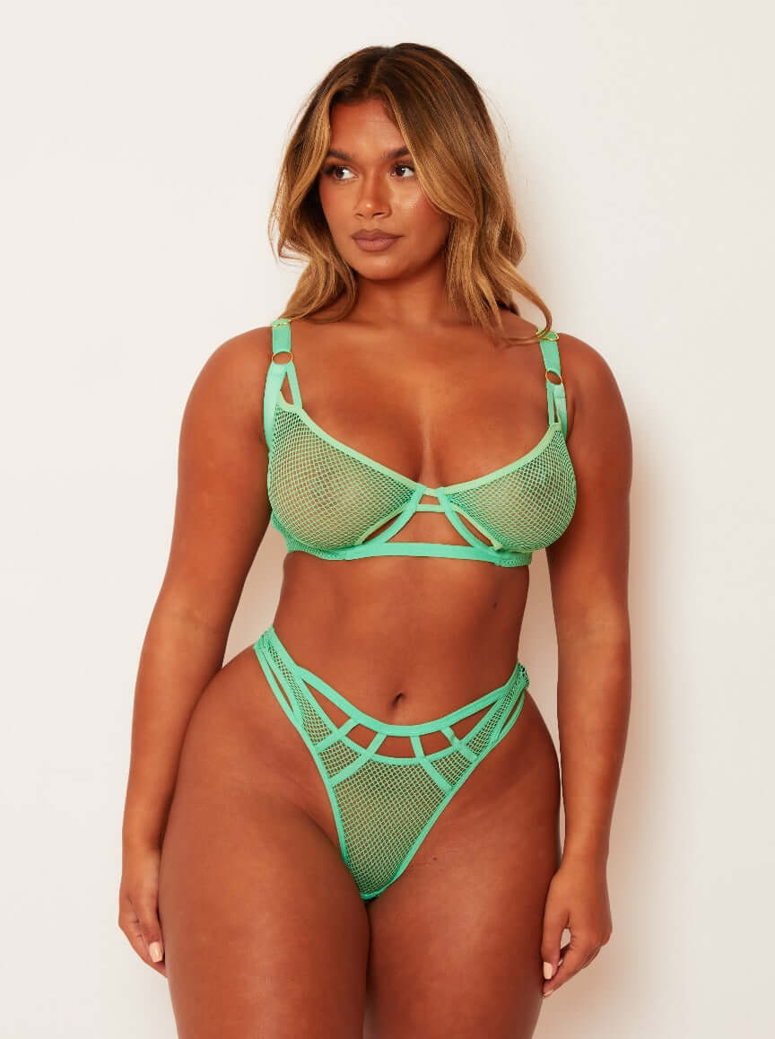 Cet ensemble Aphrodite est sur le point de devenir votre incontournable pour une nuit d'amour-propre et de romance. Dans une teinte vert pomme intense, vous ressentirez la puissance de ce soutien-gorge demi-plongeant avec armatures et découpes. Avec ses détails dorés emblématiques et ses détails en résille, vous aurez l'air d'une force avec laquelle il faut compter. De plus, grâce aux bretelles réglables, vous pourrez trouver l'ajustement parfait pour votre forme unique !