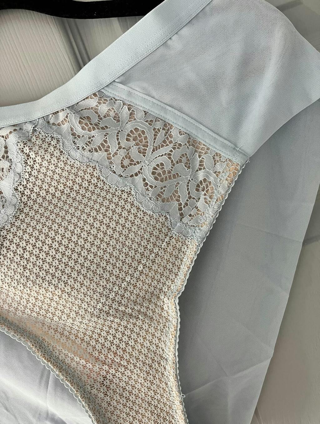 Frankie is such a cosy set, nude layers behind ice blue mesh,