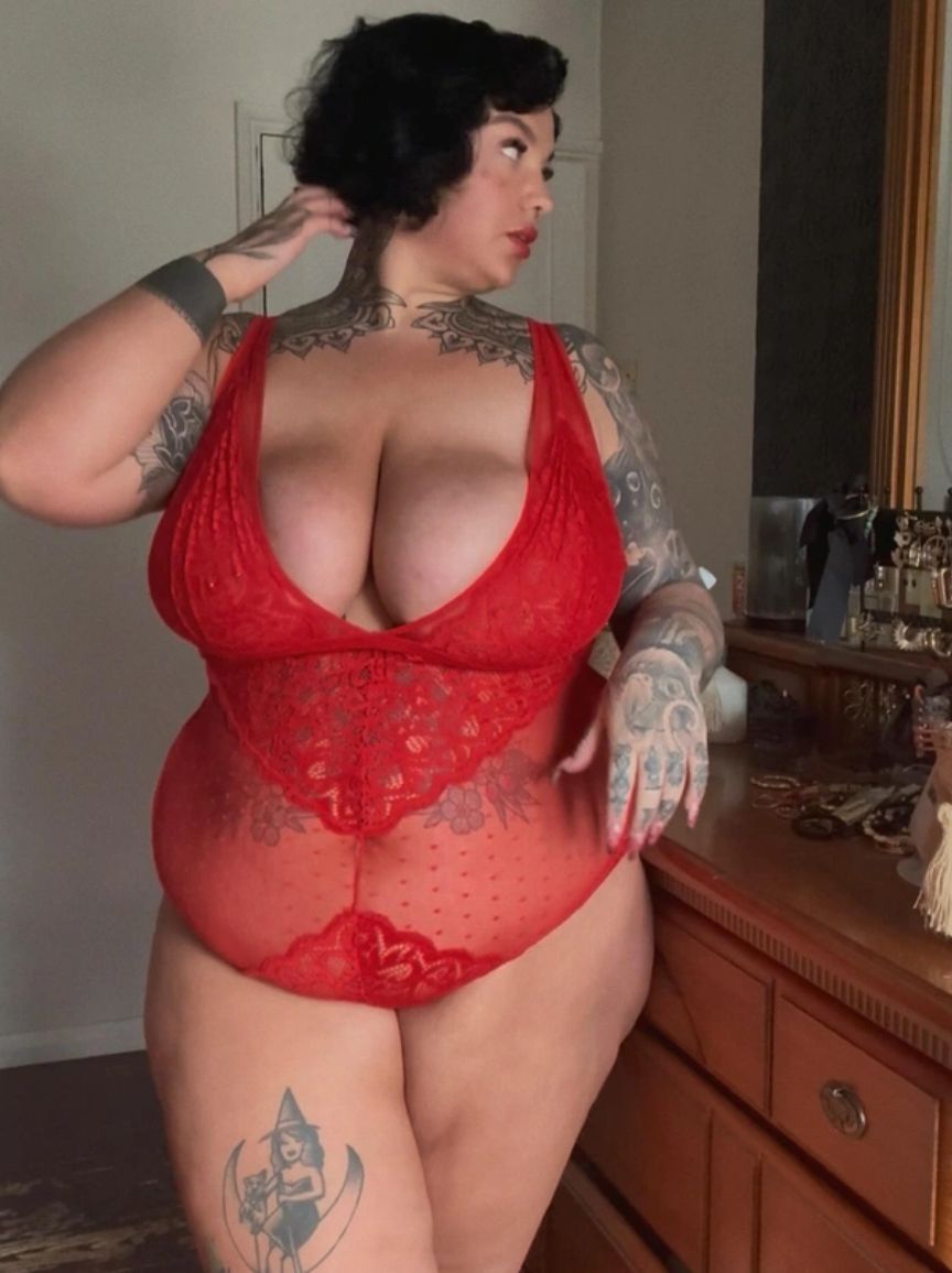 Woman wearing a red lace lingerie bodysuit against a plain background